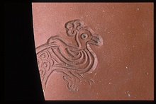 Description:   Late Roman C plate(?) fragment. None of the rim preserved but profile complete from base ring to center of plate. Base ring narrow and low, flat and rouletted on the bottom. A peacock neatly stamped into the center of the bottom, faces right. part of his tail is broken away.