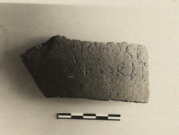 | Description: | From a coarse pot. Incised outside, lengthwise to the pot: <graphic> Pinkish-brown clay with fine mica, grits and gray core. | |