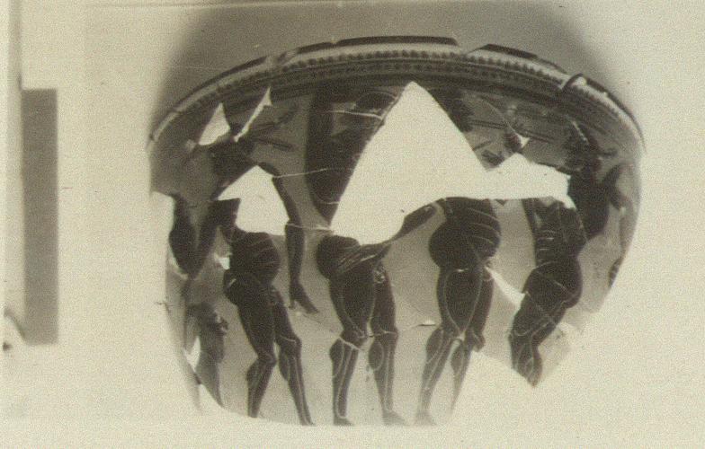 | Description: | Mended from many pieces. Nearly half of the body and the rim is preserved. The foot is entirely missing. Traces of one handle. In center, a nude flute player to right. On either side, two male dancers. The figure on the extreme left is standing right but turning back to touch the horn of a bearded goat below the left handle. Three of the dancers wear sprays of ivy. Red for beards and for the neck of the goat. From left to right the figures wear alternately red fillets and white wreaths. Where a white wreath is worn, a red forelock is the rule. The ivy berries were originally white. Offset lip; reserved line round top of mouth. Good black glaze on interior. | |