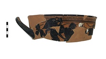 | Description: | A section of rim and about half of upper part, including one handle, mended from many fragments. The head and hands of a flute player are preserved. To her left are three male figures, two possibly dancing, the center one bracing his left hand on his hip to carry an amphora on his left shoulder. To right of the woman, another dancing figure. Traces of the head of a water bird(?) below the handle. There are very faint traces of white on the flute player's face. Her hair may have been yellow at one time: now only a thick application of white is left, like that on her hands. White is used also for a wavy chaplet around the neck of the bearded figure behind her, and for the berries of the vine in the field. Red for forelocks, beards, napes of necks and for the fillet about the head of the woman. Good black glaze on interior; reserved rim around inside of lip. Cf. P 1549 with head of flute girl. Possibly from reverse of this vase. | |