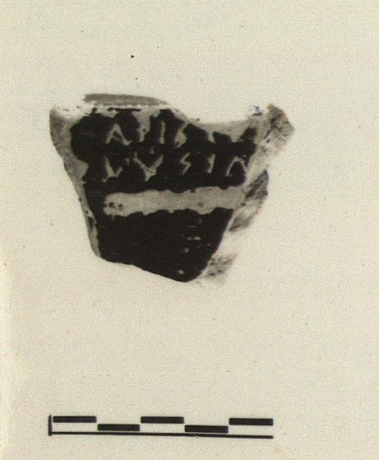 | Description: | From the rim of a black glazed krater (column krater?). Incised inside just below the rim: <graphic> Broken off at right, third line deliberately erased. | |