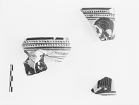 | Description: | Small part of rim and side preserved. Offset lip; reserved line around top of mouth. Scene depicts Athena, left, wearing crested helmet; the line of the crown of the helmet is outlined by dots. White used for flesh, for snakes of aegis, for dots on crown and for edge of plume of helmet. Red for band around crown of helmet. Good black glaze on interior. Same pot as P 1551. | |