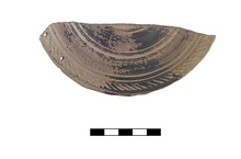 | Description: | A single fragment preserves about one-third. Rather steep convex lid with tie holes at edge. Glazed, with three pairs of reserved bands, and a one of diagonals at edge. Dull black glaze, much peeled. | |
