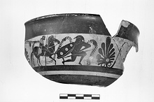 | Description: | Figured zone depicts horseman and hoplite. a) About half of body and rim preserved. Handles and foot missing. Beginning of handle indicated at right. Summary work. White used for panels on chiton and for wreath of rider, for the balls on the shield and for the decoration of the plume of the hoplite, also for the hearts of the palmettes and the grapes in the vine. Trace of red on the mane of horse. b) Handle and part of side preserved. Trace of spiral of handle; palmette. Good black glaze on interior. Reserved band on inside rim of lip. | |