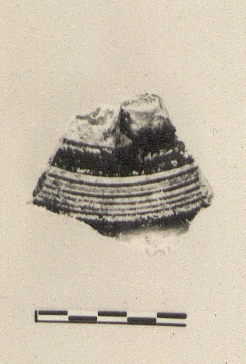 | Description: | Fragment from shoulder with stump of one handle. Decoration in red glaze; narrow horizontal lines, flanked by broad red bands on shoulder; above, traces of a pattern with wavy lines; below, double hooks. Buff clay, buff slip. | |