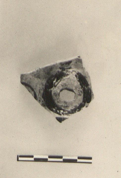 | Description: | Fragment preserving stump of spout. Decoration in black-brown glaze; solid band around base of spout, traces of circle or spiral on shoulder. Dark buff clay with grit. | |