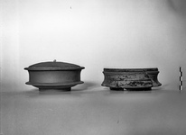| Description: | Mended from several pieces; about half preserved. Concave side wall with rim inset to take lid; broad curving flange at bottom, with moulded ridge underneath it. Ring foot set well in. Black glaze much worn over all, except on resting surface of foot and on bottom, where there are alternating glazed and reserved bands. | |