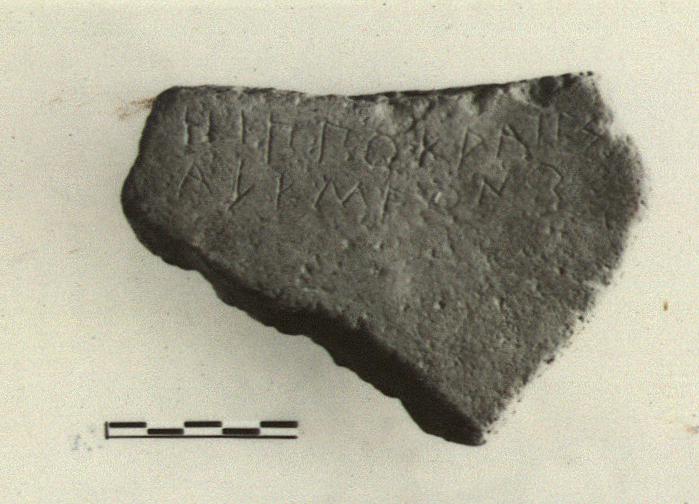 | Description: | Heavy fragment of coarse red clay, unglazed; probably from a rain tile of Laconian type. Incised on smoother concave side: <graphic> | |