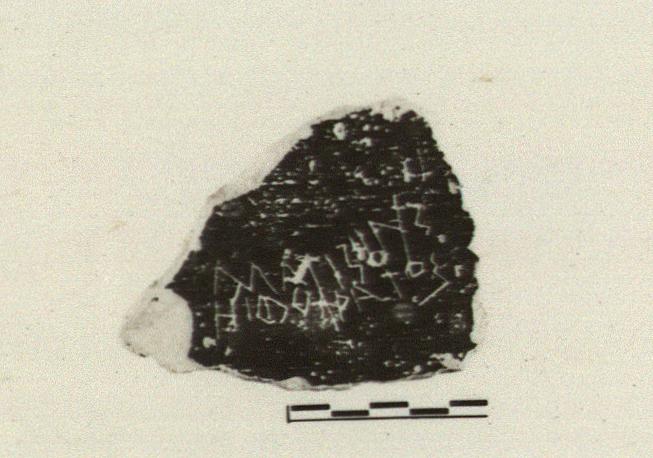 | Description: | Fragment of semi-glazed krater; black glaze inside, chipped; and a reddish-brown band outside. Incised inside: <graphic> | |