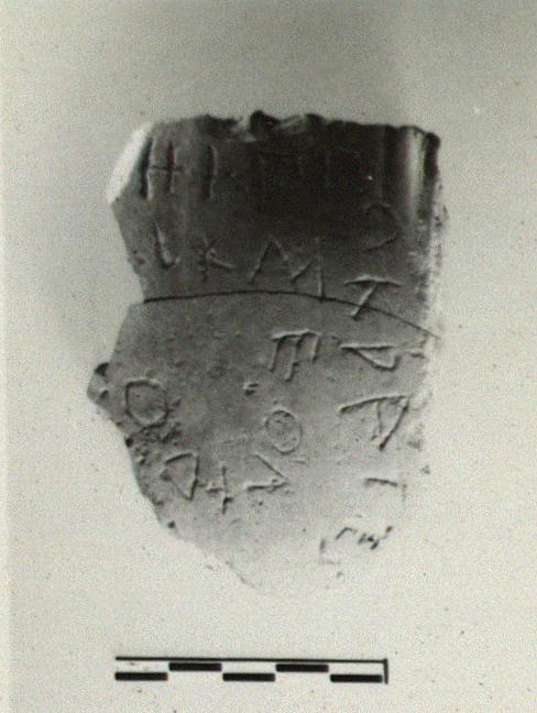 | Description: | Mended from two pieces. From a coarse unglazed pot of pinkish-buff clay. Incised outside, running around the fragment in two lines: <graphic> | |