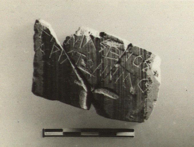 | Description: | Mended from three pieces; from an amphora with thin streaky glaze wash outside; pale buff clay. Incised outside, more or less vertically to the pot: <graphic> | |