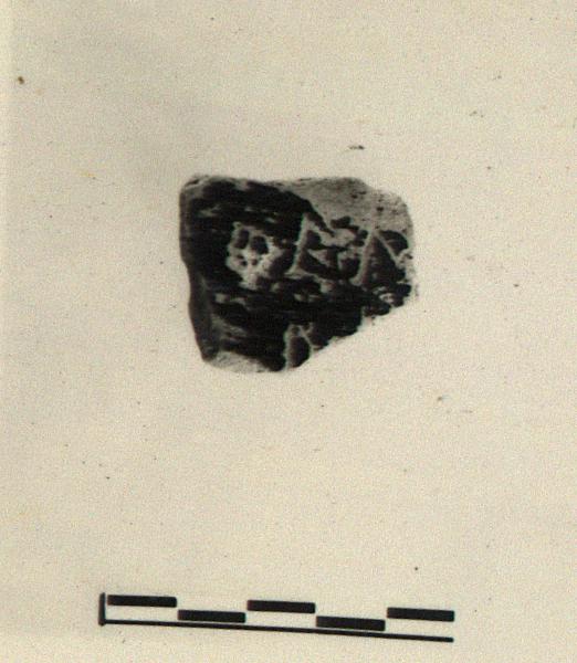 | Description: | From an open red figured pot, column krater? Outside, ground line and set of toes, left; coarse work; no relief contour. Incised inside, upside-down to pot: <graphic> | |