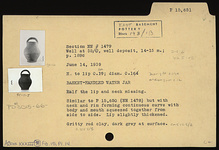| Description: | Half the lip and neck missing. Similar to P 15650 (ΝΝ 1478) but with neck and rim forming continuous curve with body and mouth squeezed together from side to side. Lip slightly thickened. Gritty red clay, 2.5YR 5/6; dark gray at surface, ca. 5YR 5/2. ADDENDA P 15650: Ring foot and short plump body with straight lip. Low unridged handle. | |