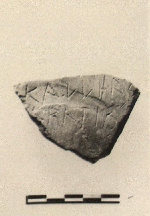 | Description: | Broken all around, but all original ostrakon surfaces apparently preserved. Fragment of side wall of coarse pot of pinkish-buff clay. Inscribed on outside, lengthwise to pot: <graphic> Cf. Hesperia Suppl. 5 (1941), p. 1441, no. 29. | |