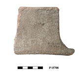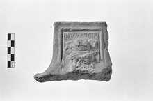 Description:   Inside surface of lug, including pot rest, broken away below. Within rectangular border a moulded garlanded head of a satyr; above the head the stamped signature: Ε Κ Α Τ Α Ι Ο Υ