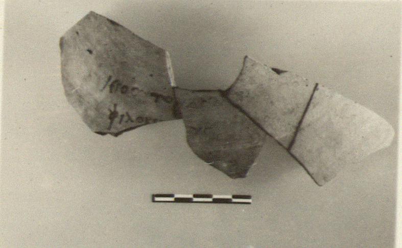 | Description: | Several joining fragments give part of the shoulder of a small coarse amphora. Inscribed: <graphic> Brownish gritty clay; unglazed. | |