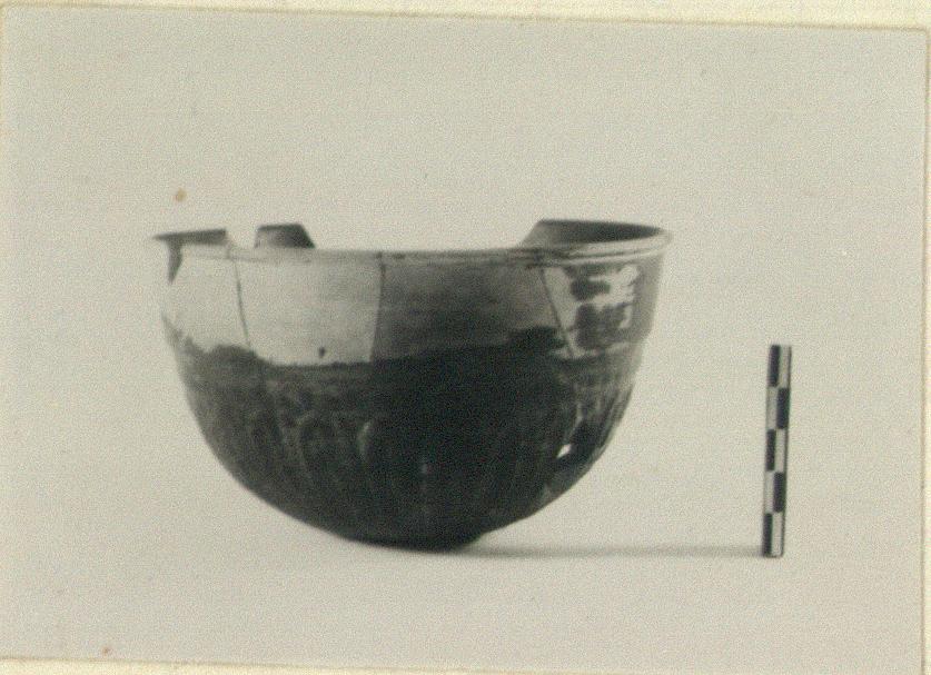 | Description: | Broken but almost complete. Long petals with jewelled lines between; two bands above, one of circles and one of eggs. Plain medallion. Metallic glaze, black and red; somewhat worn at top. Cf. Agora XXXII, p. 93, n. 39. | |
