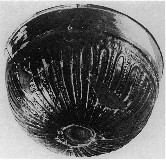 | Description: | Broken but almost complete. Long petals with jewelled lines between; two bands above, one of circles and one of eggs. Plain medallion. Metallic glaze, black and red; somewhat worn at top. Cf. Agora XXXII, p. 93, n. 39. | |