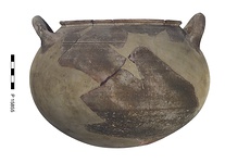 | Description: | Restored in plaster. Squat round body, convex at the bottom; two rolled handles at the shoulder. Slightly projecting rim, flanged inside to receive lid. Two grooves on shoulder at base of handle attachments. Brown to red cooking ware fabric. | |
