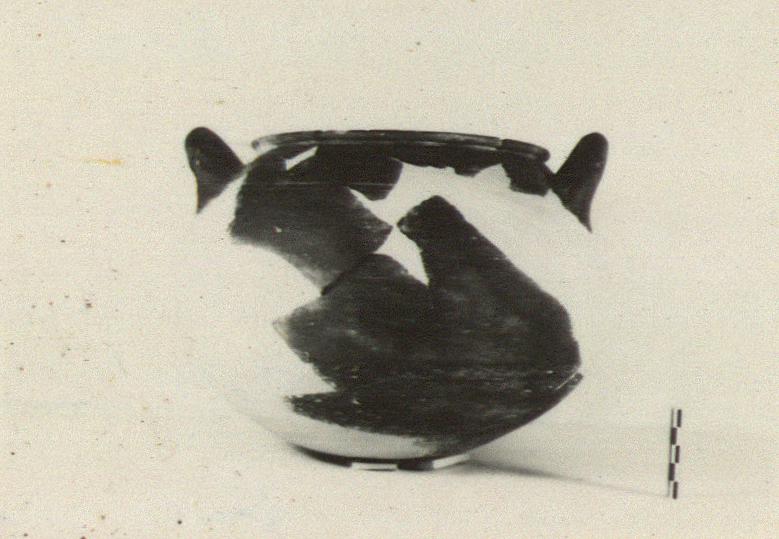| Description: | Restored in plaster. Squat round body, convex at the bottom; two rolled handles at the shoulder. Slightly projecting rim, flanged inside to receive lid. Two grooves on shoulder at base of handle attachments. Brown to red cooking ware fabric. | |