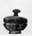 | Description: | Mended from many pieces; part of wall and rim of bowl, and of rim of lid, missing; restored in plaster. Hemispherical bowl on ring foot; high vertical flange for lid, inset. Flat-topped lid with plain down-turned rim. High central handle with stepped knob. Fairly good black glaze all over, inside and out, somewhat mottled and worn. The clay brownish. | |