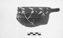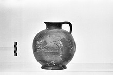 | Description: | Handle and fragments from neck and wall missing; restored in plaster. Flaring ring foot, almost spherical body, low neck with plain everted lip; vertical strap handle from lip to shoulder. A band of five wheel-run grooves below middle of body. Reddish-brown clay; fair black glaze on exterior all over and inside to base of neck. | |