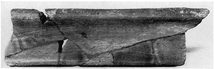 | Description: | Numerous fragments preserve part of wall to full height and the adjoining floor to its full width(?); at one end, the wall preserves the beginning of the curve that marked the end of the tub. Flat floor, vertical wall, rounded rim thickened somewhat on exterior. Incised on rim: M I Pinkish-buff clay, coarse, with few bits, apparently mixed with straw. Black glaze, somewhat worn, on interior and rim. Fragments of similar tubs in tins 505, 506. | |
