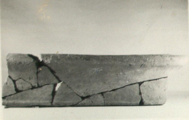 | Description: | Numerous fragments preserve part of wall to full height and the adjoining floor to its full width(?); at one end, the wall preserves the beginning of the curve that marked the end of the tub. Flat floor, vertical wall, rounded rim thickened somewhat on exterior. Incised on rim: M I Pinkish-buff clay, coarse, with few bits, apparently mixed with straw. Black glaze, somewhat worn, on interior and rim. Fragments of similar tubs in tins 505, 506. | |