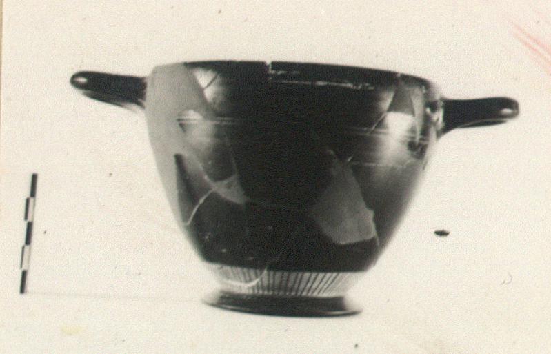 | Description: | Fragments missing from wall; restored in plaster. The wall more drawn in at rim and above base than in P 15975 (ΓΓ 651); the fabric finer, the glaze better, and the foot thinner and more flaring. Same scheme of decoration. On the reserved underside, a small and a large circle, with a central dot. ADDENDA P 15975: coarse "rays" on reserved band above foot; two purple lines below handles, one at upper edge of reserved band. Base reserved, reddened and undecorated. Reserved line around inner edge of rim; insides of handles and handle spaces reserved. | |