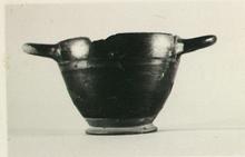 | Description: | A few fragments missing from wall; restored in plaster. Shape similar to P 15975 (ΓΓ 651), but smaller. Inside of handles not reserved; a single purple band near handles. A broad purple band on a reserved area just above foot replaces the rays. Upper surface of foot reserved, and space inside foot, with no circles. Glaze worn and rather streaky. ADDENDA P 15975: Substantial cup, little drawn in at rim. Rather thick foot, coarse "rays" on reserved band above foot. | |
