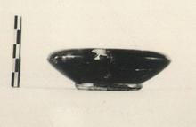 | Description: | A few fragments missing from wall and lip; restored in plaster. Small bowl on disk foot, slightly concave. Low flaring straight wall; thickened lip turned slightly inward and curving down to meet wall at oblique angle. Heavy fabric; good black glaze; bottom reserved; red wash prominent. | |