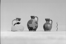 | Description: | Fragments of body and most of handle missing; restored in plaster. Plump ovoid body on flat, raised base, slightly projecting. Narrow neck with slightly flaring straight lip. Vertical strap handle from below lip to shoulder. A light ridge at the base of the neck. Good black glaze, somewhat worn, outside, on inside of lip, and dripped down over base. Bottom reserved. | |