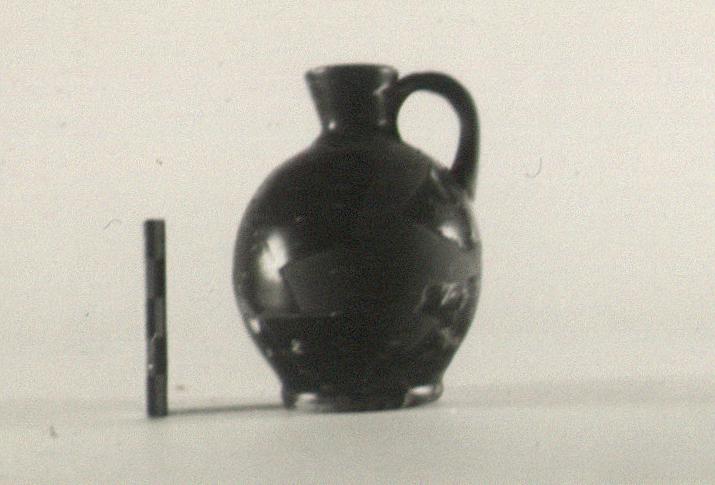 | Description: | Fragments of body and most of handle missing; restored in plaster. Plump ovoid body on flat, raised base, slightly projecting. Narrow neck with slightly flaring straight lip. Vertical strap handle from below lip to shoulder. A light ridge at the base of the neck. Good black glaze, somewhat worn, outside, on inside of lip, and dripped down over base. Bottom reserved. | |