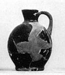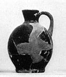| Description: | Fragments of body and most of handle missing; restored in plaster. Plump ovoid body on flat, raised base, slightly projecting. Narrow neck with slightly flaring straight lip. Vertical strap handle from below lip to shoulder. A light ridge at the base of the neck. Good black glaze, somewhat worn, outside, on inside of lip, and dripped down over base. Bottom reserved. | |