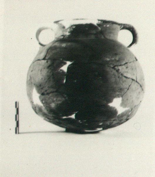 | Description: | One handle, part of the other handle, fragments of body and lip missing; restored in plaster. Spherical body, somewhat flattened toward bottom. No base. Broad, low neck, flaring toward top; slightly thickened lip, flat on top and sloping to outside. Two vertical handles from lip to just below neck. Typical coarse cooking pot fabric; dull red slip; blackened by fire in lower half. ADDENDA Possibly a Palestinian import? See Crowfoot, et al, Samaria-Sebaste III, p. 130, fig. 12, nos. 11-12 (period VIII, 7th.-6th. c. BC) and p. 229, fig. 41, no. 1 (Hellenistic). Our piece by shape possibly between the two dates (GRE). | |