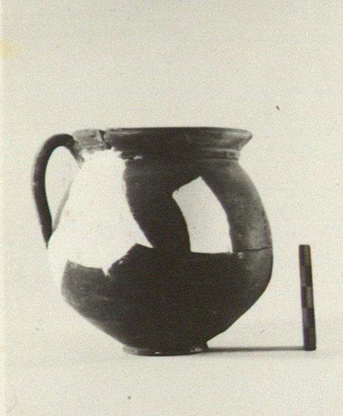 | Description: | Fragments of rim, body and bottom missing; restored in plaster. Flaring rim, set off by a ridge from roundish body; wide mouth. Single vertical handle. Small flat raised base. Grayish clay; unglazed. | |