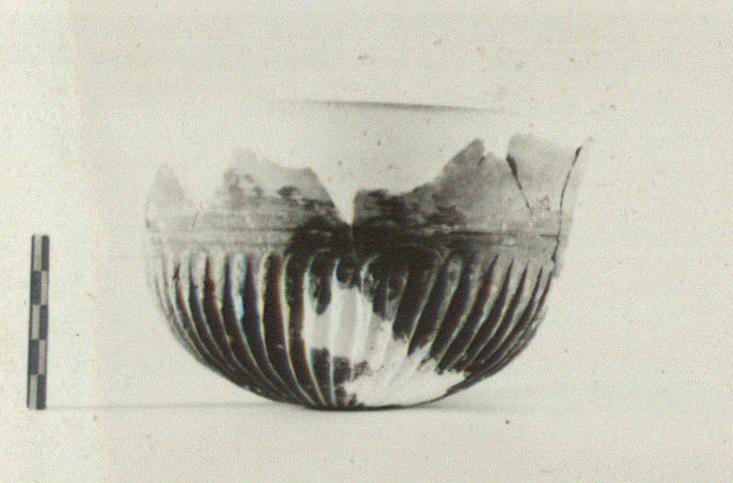 | Description: | Most of lip and some of body missing; restored in plaster. Plain rim, out-turned. Raised ribs on body, rosette on bottom. Dull black glaze. Cf. P 20518. | |