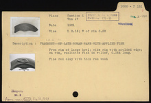 From rim of large Late Roman A bowl; wide rim with moulded edge on which realistic fish in relief.