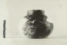 | Description: | About half of mouth and body missing; restored in plaster. Round straight-sided neck-mouth with plain lip, slightly thickened. Spheroid body, flat bottom, no foot. No trace of any handle. Dull glaze, much worn, inside and out. | |