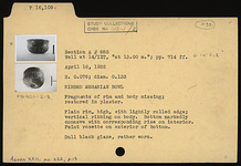| Description: | Fragments of rim and body missing; restored in plaster. Plain rim, high, with lightly rolled edge; vertical ribbing on body. Bottom markedly concave with corresponding rise on interior. Faint rosette on exterior of bottom. Dull black glaze, rather worn. | |