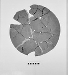 Description:   Fragments missing; restored in plaster. A large, plain roughly made flat disc. A small segment cut off at one point. Four small holes near center.
