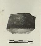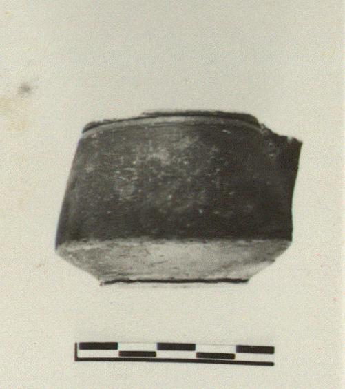 | Description: | The high-swung handle and chips of the lip missing. Deep angular body with nearly straight walls tapering to plain lip marked off by groove around top of wall. Lower part of body cuts sharply inward to rough flat bottom. Dull red to black glaze, all over. | |