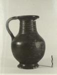 | Description: | About half of mouth missing; restored in plaster. Minor chips, especially on foot. Round mouth with projecting torus lip; horizontal ribbing on neck; double handle. Plump body on high spreading ring foot. Gray clay; metallic black glaze discolored to reddish-brown over much of one side, when found, probably by contact with iron rust; discoloration largely removed by further cleaning. Cf. coarse pitcher P 14448. | |