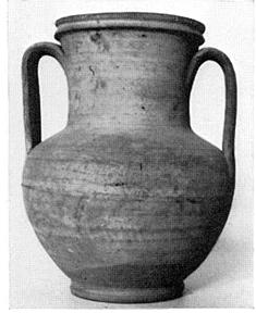 | Description: | Fragment of one side missing; restored in plaster; above this, a crack runs up to the mouth; otherwise unbroken. Profiled lip; wide cylindrical neck. Flat handles, from below lip. Squat ovoid body on ring foot. Buff clay; light buff slip. | |
