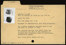 | Description: | Two joining fragments preserve part of rim and much of profile of body. Two reserved grooves just below plain rim on exterior; the rest of the exterior is covered with horizontal bands of rouletting, irregularly spaced. Dull black glaze inside and out. | |