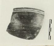 | Description: | Two joining fragments preserve part of rim and much of profile of body. Two reserved grooves just below plain rim on exterior; the rest of the exterior is covered with horizontal bands of rouletting, irregularly spaced. Dull black glaze inside and out. | |