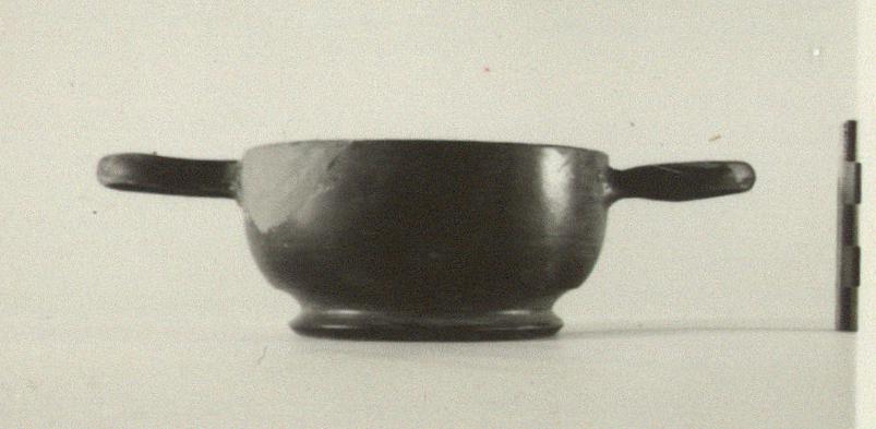 | Description: | Fragment of rim missing. Plain rim; elongated, horizontal handles. Straight sides; ring foot. At center of floor a small impressed circle about which four impressed palmettes. Good black glaze except within foot which is reserved and decorated with dot, a broad and two narrow circles; also remains of red miltos wash. | |