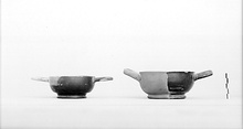 | Description: | Some of rim and body missing; restored in plaster. Shape and scheme of decoration similar to P 16138 (Δ 717). At center of floor, four single stamped palmettes close together. Glaze a firm dull black except around upper part of outside and on handle, where it is reddish and somewhat worn. ADDENDA P 16138: Plain rim; elongated, horizontal handles. Straight sides; ring foot. At center of floor a small impressed circle about which four impressed palmettes. | |