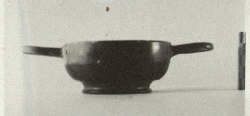 | Description: | Some of rim and body missing; restored in plaster. Shape and scheme of decoration similar to P 16138 (Δ 717). At center of floor, four single stamped palmettes close together. Glaze a firm dull black except around upper part of outside and on handle, where it is reddish and somewhat worn. ADDENDA P 16138: Plain rim; elongated, horizontal handles. Straight sides; ring foot. At center of floor a small impressed circle about which four impressed palmettes. | |