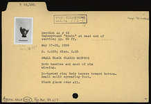 | Description: | Both handles and most of rim missing. In-turned rim; body tapers toward bottom. Small solid spreading foot. Black glaze over all. | |